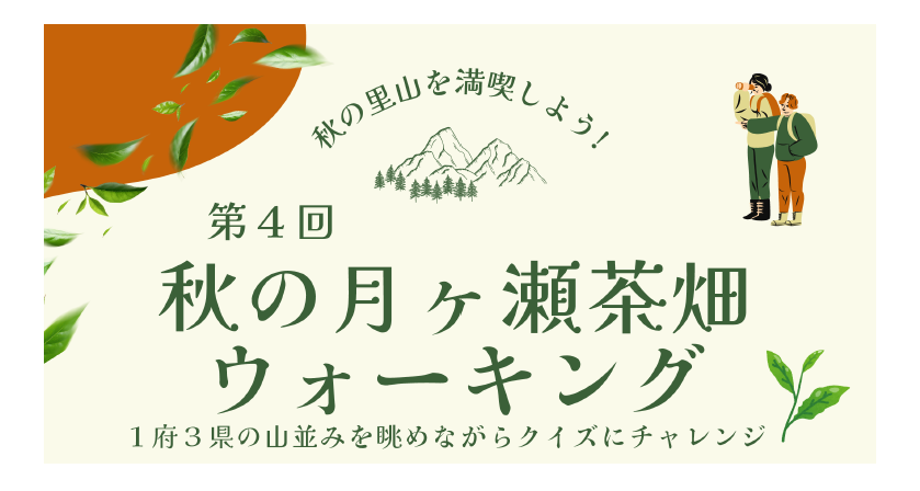 1府3県の山並みを眺めながらクイズにチャレンジし、紅葉の茶畑を歩くイベント! 約4.5km、1.2~2時間のコースです。 秋の美しい月ヶ瀬へ、ぜひお越しください。 日時:令和7年11月16日(日) 受付:9:45~10: […]