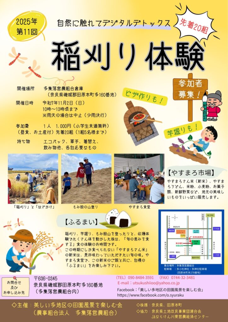 稲刈り、芋堀りの収穫体験やもみ山を登ったりと楽しんでいただけます。「やすまろさん米」の新米と共に「ふるまい」もお楽しみに!!皆様の参加をお待ちしております。